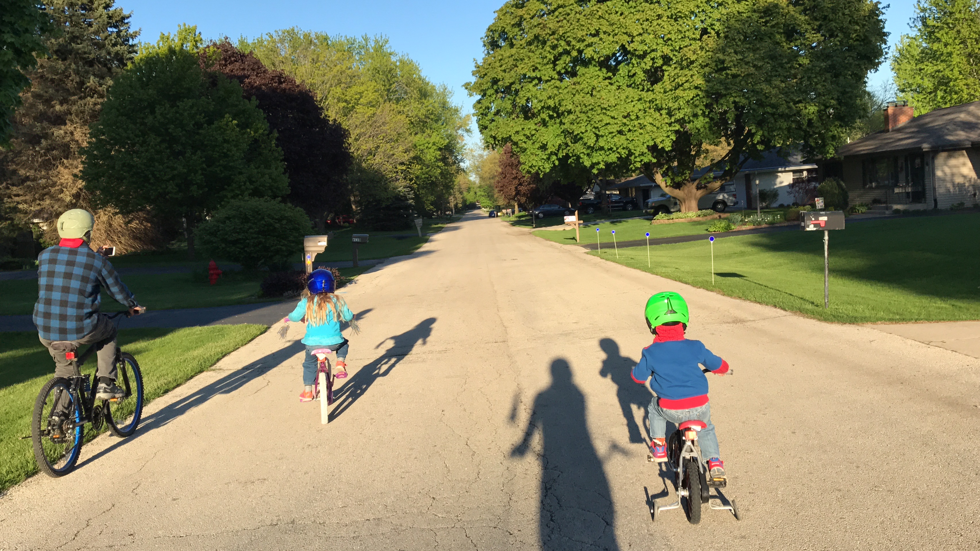 Once we made it back home, it was right on the cusp of too early to get the kids ready for bed and too late to do anything else, but I just decided to squeeze in our first family bike ride. The weather here in Illinois is so strange. It’s been sunny, but really too cold to be out in. And then RIGHT before the sun goes down, the wind stops and it feels the warmest it is all day. It’s actually exactly perfect sweater weather just before night fall. So we just had to take advantage.